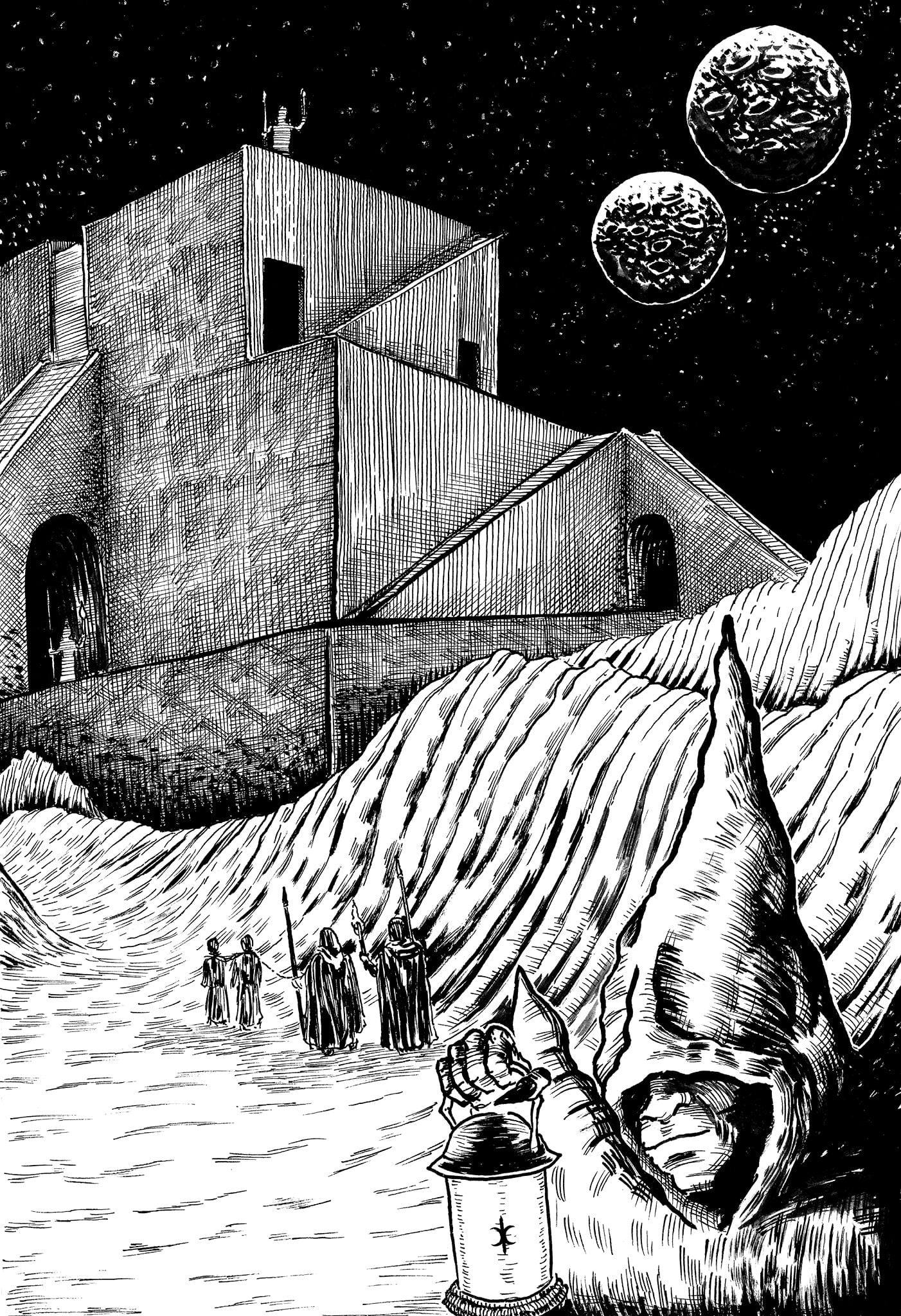 Mantivemos o sacerdote ferido em cima da yeldra e assim prosseguimos a marcha, logo nos aproximamos do imenso paredão de pedra. Aquela maligna montanha de formação estranha, artificial. Eu já havia entrado em contato com a hostil tribo que vive ali, avisei meus companheiros sobre o perigo e contornamos o lugar faceando a parede lisa, tentando assim evitar possíveis ataques de dardos provindos de inimigos escondidos nas fissuras no alto da rocha.
